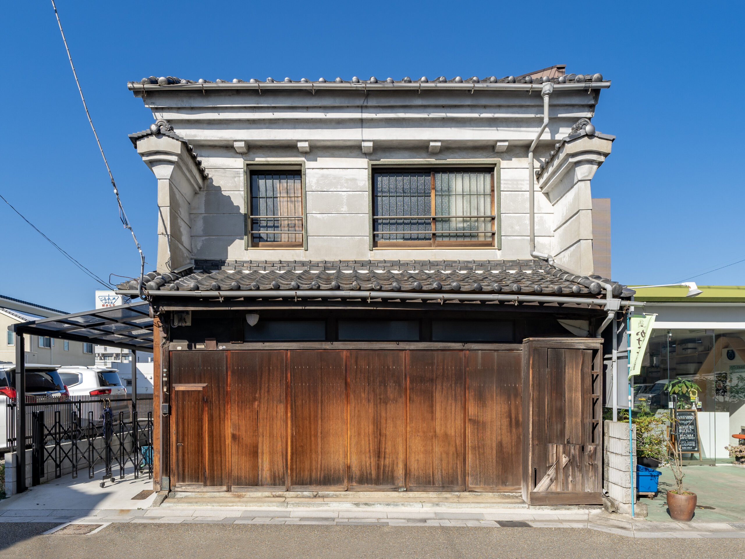 うだつのある重厚な蔵⾵の外観が往時の繁栄を偲ばせる、大正13年建築。